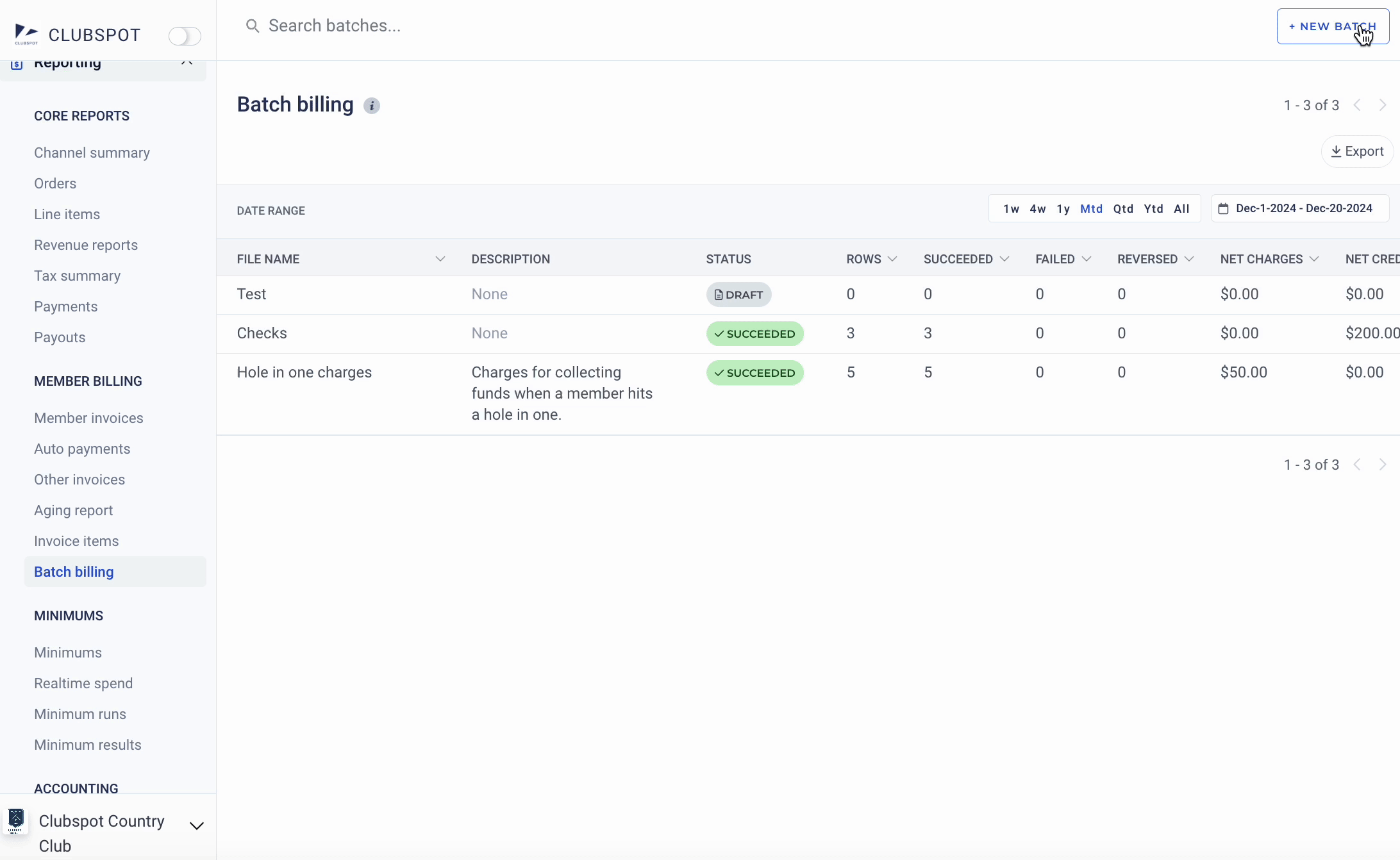 Once you have your batch file ready, export it as a .csv file (comma separated values) and will be able to upload it to Clubspot. Navigate to Reporting>Batch Billing section of the dashboard, select “+ new batch” in the top right corner, and upload your file.