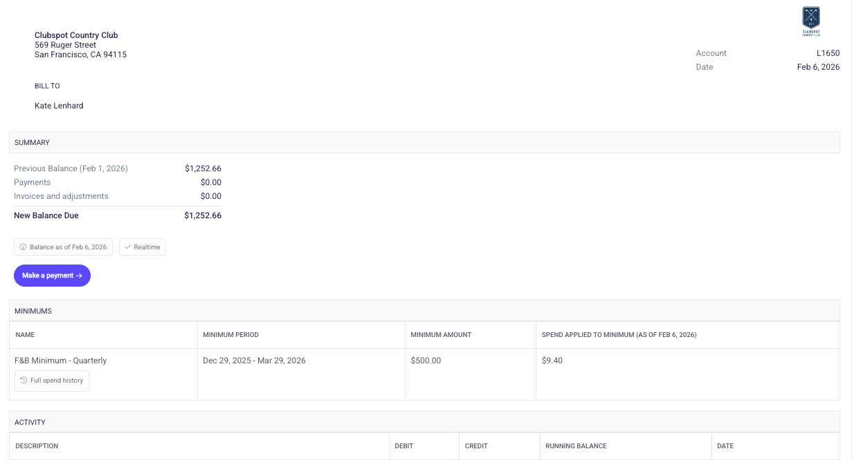 While minimum spend is always visible in the member's portal, you may also elect to include it on their monthly statement for additional transparency. If so, please reach out to support@theclubspot.com so we can enable that option for you.