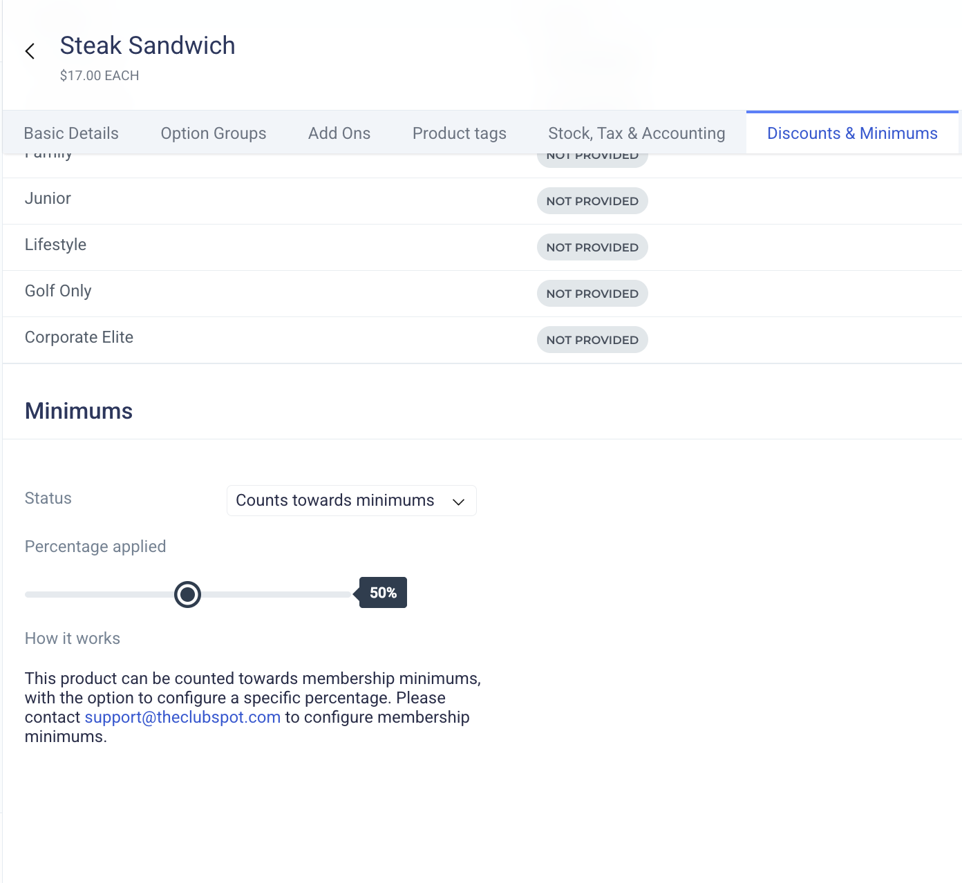 Under the Discounts & Minimums page of the Product, you’ll see a section dedicated to Minimums. Here, you can exempt a specific item by changing it from ‘counts towards minimum’ to ‘excluded from minimum’. You can also change the percentage of the item applied toward the minimum using a sliding scale.