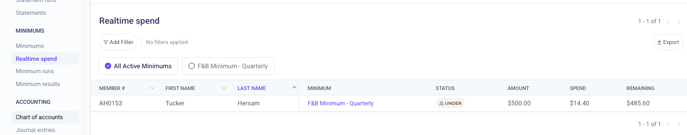 The Realtime Spend dashboard offers a breakdown of each member’s minimum including amount owed, amount spent, and amount remaining. This table can be filtered to narrow the results by membership category or plan.