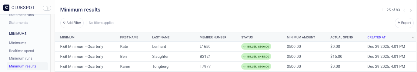 Please reach out to support@theclubspot.com if you’d like one of our team members to configure membership minimums on your account. If you have minimums enabled, Clubspot will automatically calculate and bill any difference between the minimum and actual spend for each membership.