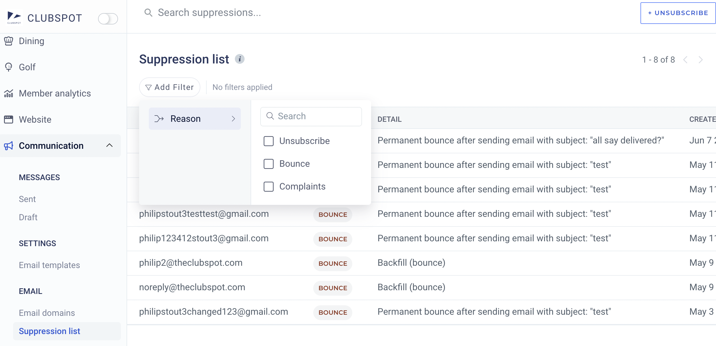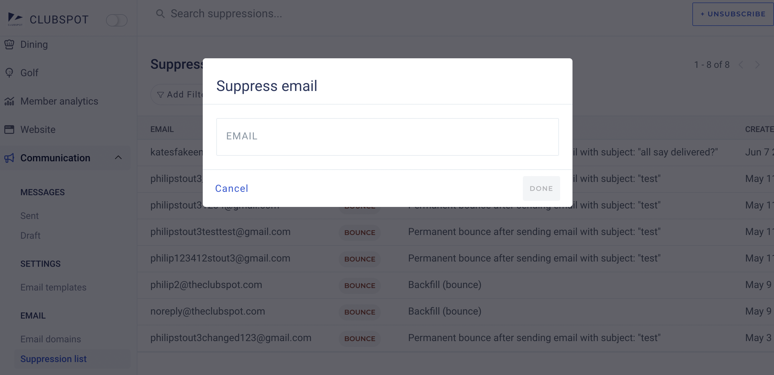 You can also add an email to unsubscribe. Click + Unsubscribe and enter the email to suppress. Keep in mind, this will unsubscribe them from all manual club communications.