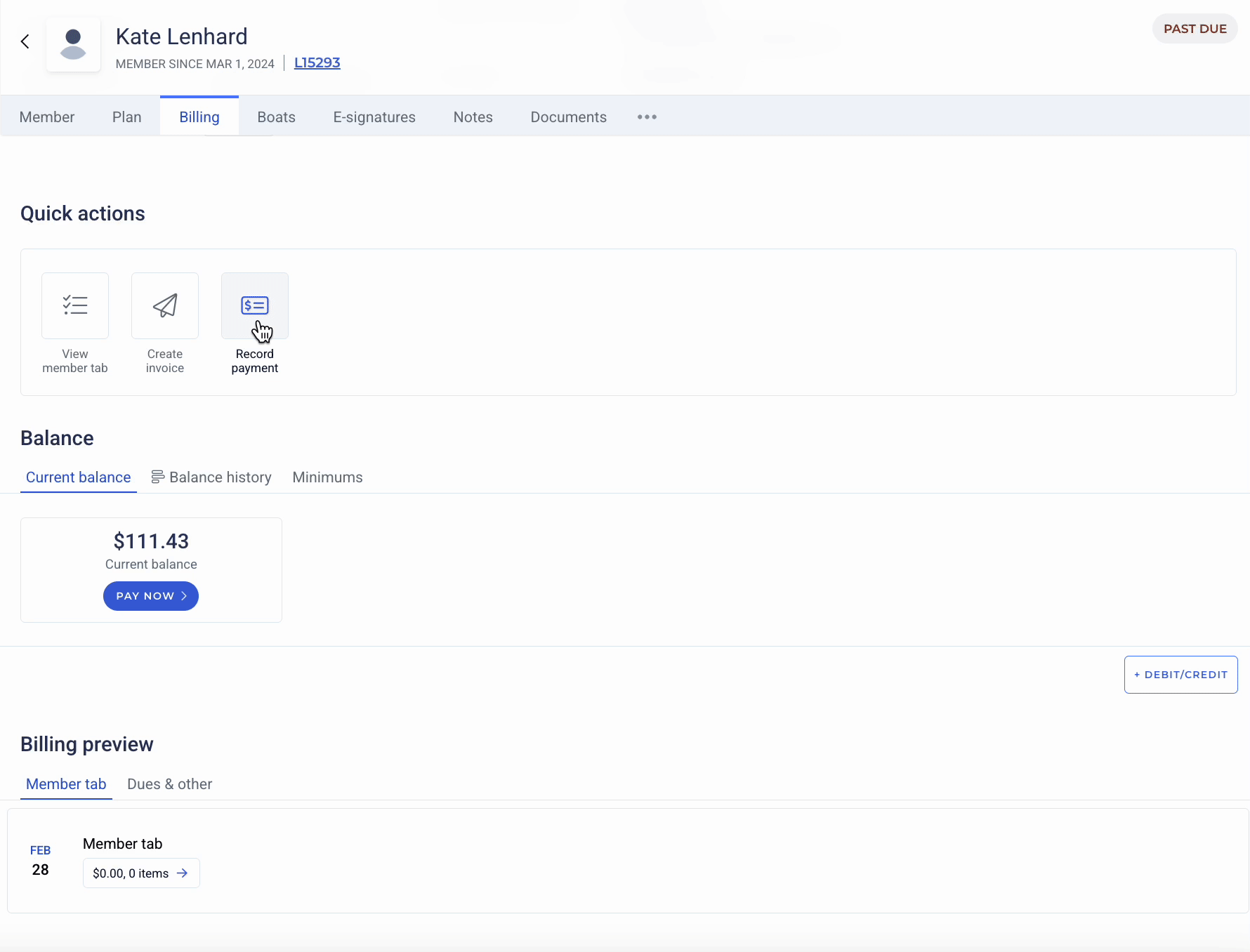 To record a check payment, click the Record Payment button from the Quick Actions menu on the Billing page of a membership. Clubspot will automatically mark any invoices that the payment can cover as PAID, and then update the member’s balance accordingly.
