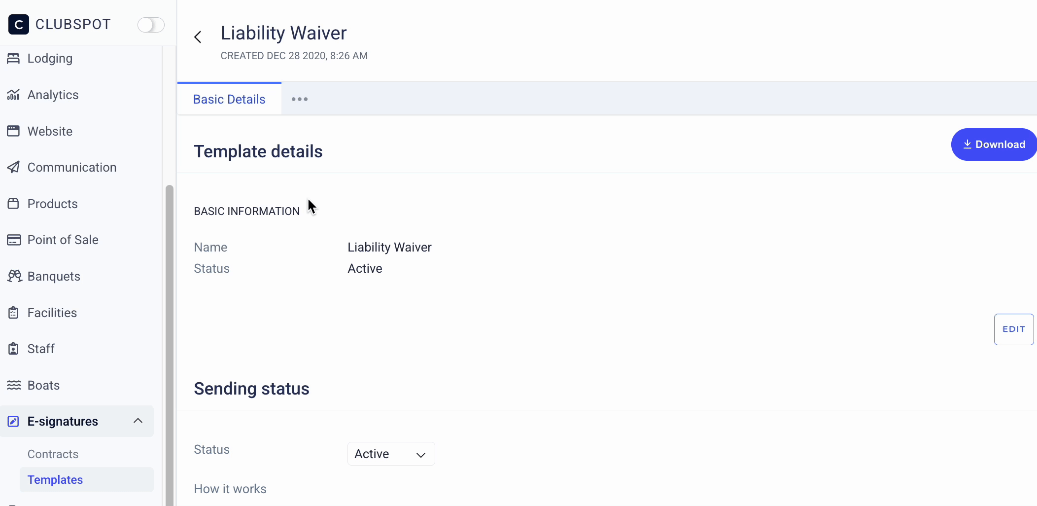 Your uploaded template will say processing under status. Once we receive the waiver and upload it using our third-party service, E-Signatures, the status will change to active. Please allow one business day to complete this process. However, if the waiver upload is urgent, please email us at support@theclubspot.com and we will do our best to expedite this process.
