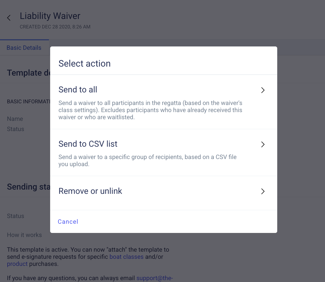 If you need to blast a new waiver out to your event participants, you can do so by navigating to the event’s dashboard, then choosing E-Signatures > Templates, then choosing the waiver and clicking the three dots next to Basic Details and choosing Send to All.