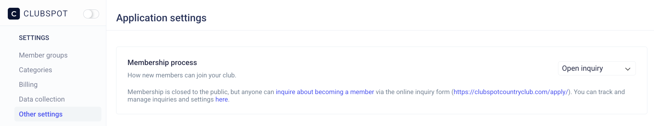 To use the Membership Inquiry form, go to Membership > Settings and ensure the Application Type is set to “Open Inquiry.”