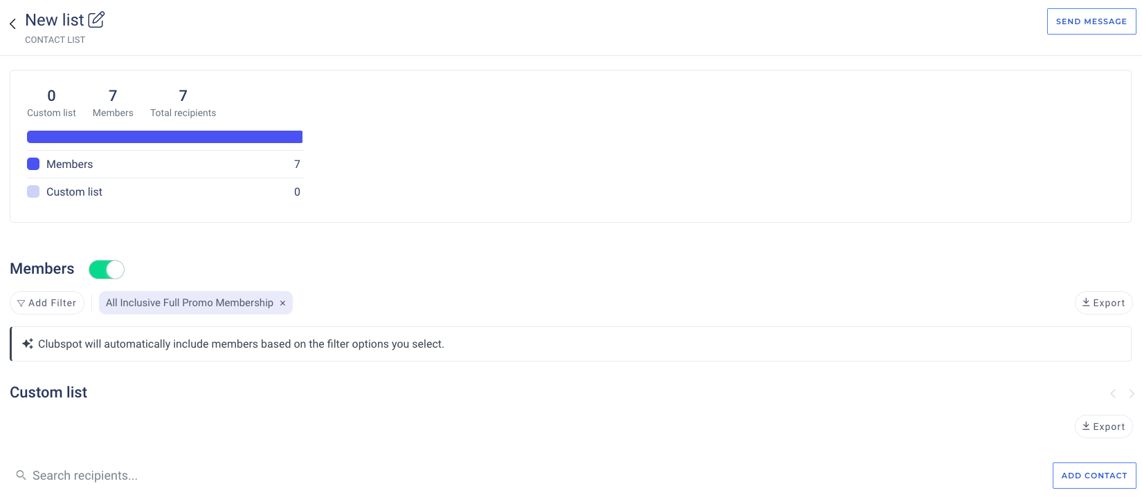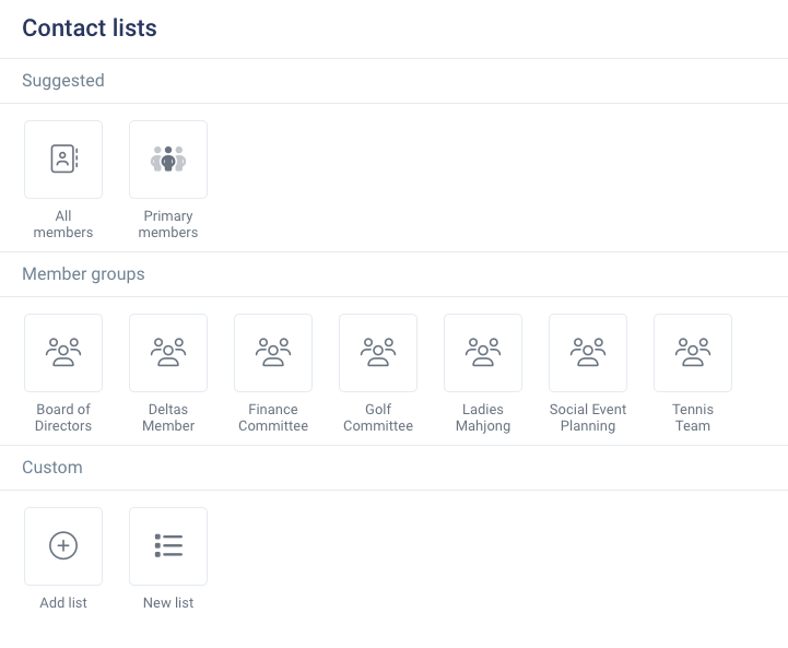 Our Suggested Lists are the backbone of efficient communication on Clubspot. These lists are pre-generated based on the most commonly used contacts by clubs. You’ll find lists such as All Members and All Primary Members, which include every active member who hasn’t expired.