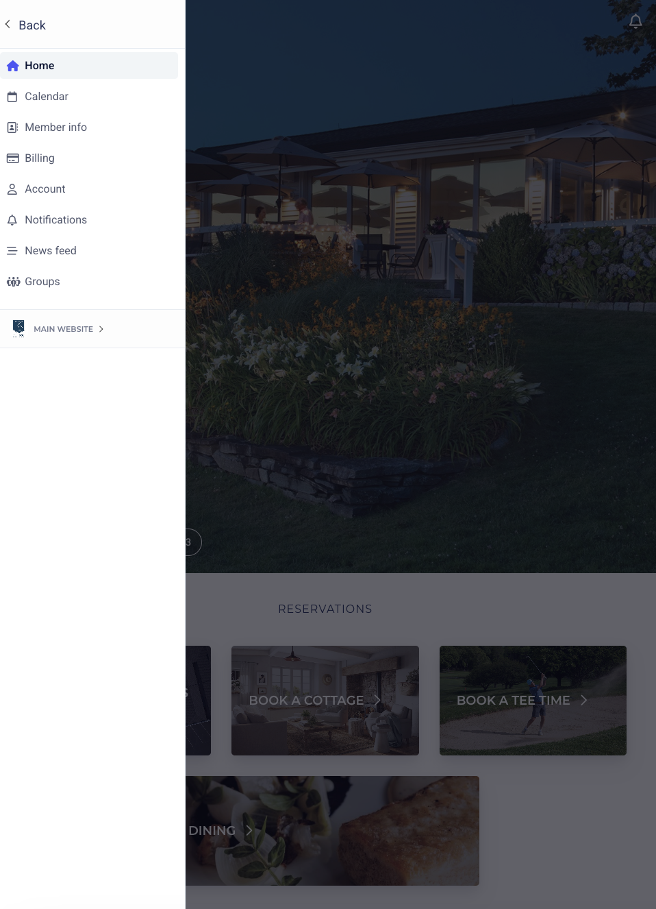 Members can navigate their portal using links in the side menu, customizable tiles, or live toolbar. Clicking on the count of upcoming events or current balance will direct the member straight to their reservations or billing page. Once on a page, the user can open the menu in the upper left-hand corner to redirect to another page in the portal or return to the main website.