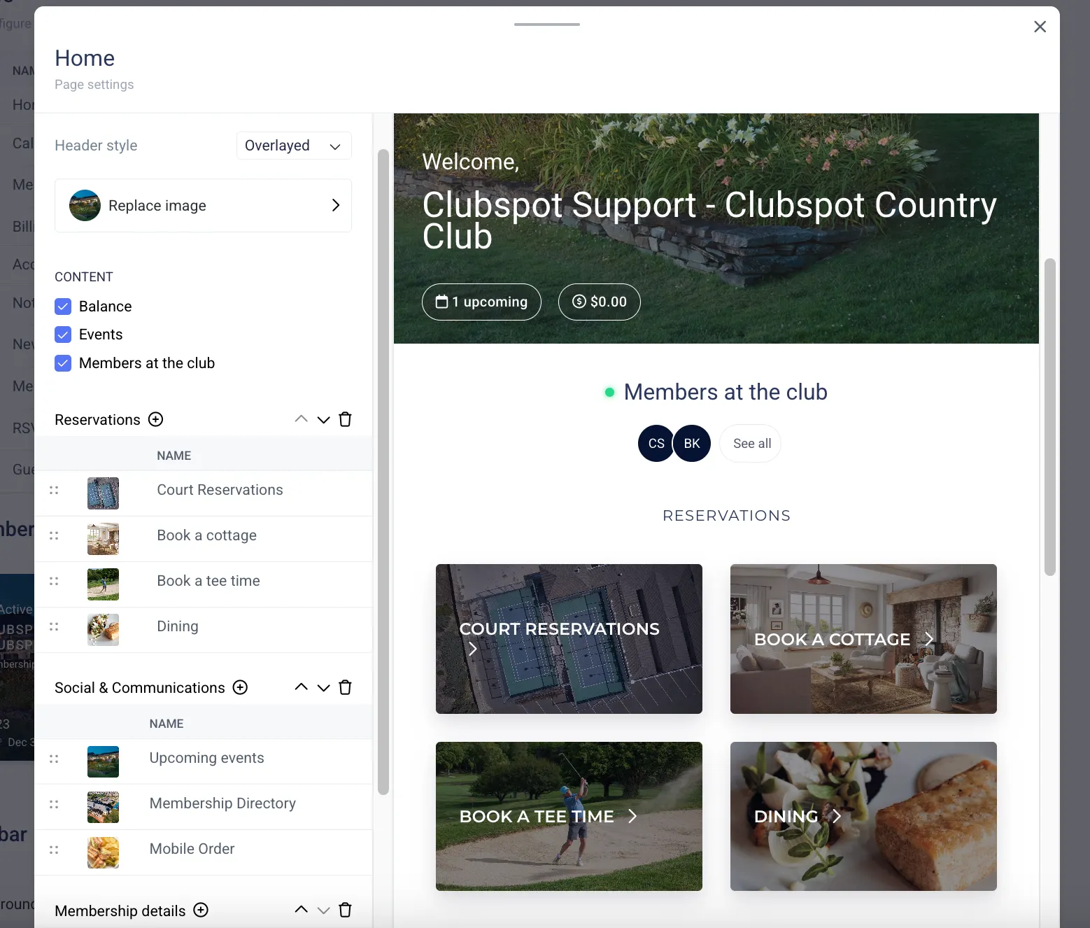 Clubspot provides a default member portal for your members to manage payments, view reservations, and more. You may choose to customize the content for your club’s member portal directly from your Dashboard, and this guide will walk you through that process. If you elect to offer iOS or Android apps for your members, this is also how you’ll design the content of the app.