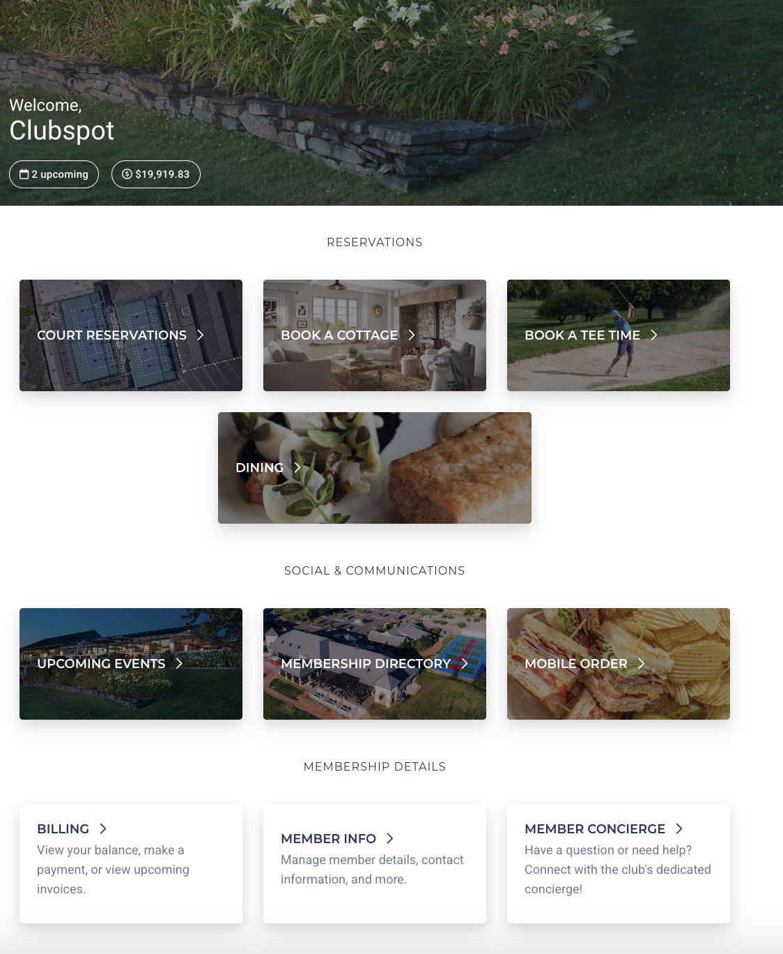 All of the images, tile options, and sections are configurable. For instance, if you want to link to a specific reservations page for tennis courts or link to a mobile ordering page, you can configure the tiles to do so. Here’s an example of a customized member portal, with the content that matters most to your members: