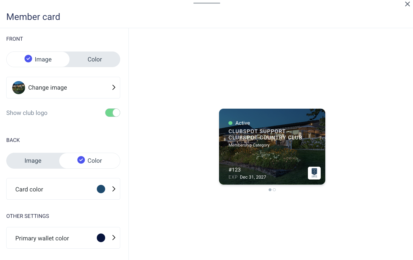 You can optionally customize the visual of your digital membership card as well. Click the ‘edit’ button next to the Member card heading of the Member portal page in the dashboard to launch the edit overlay. Here you can elect to display and image or a color on the front/back of the member card: