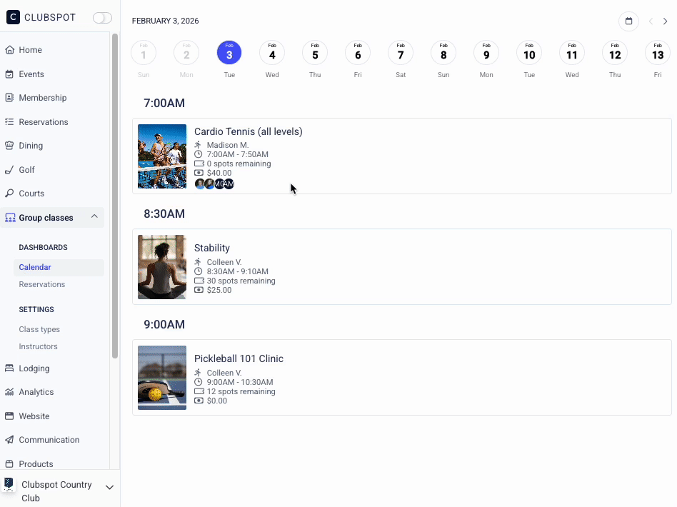 Our group classes feature makes it easy for participants to sign up for a recurring event. This is a great use case for workout classes, racquet clinics, and any other repetitive event with an RSVP requirement.