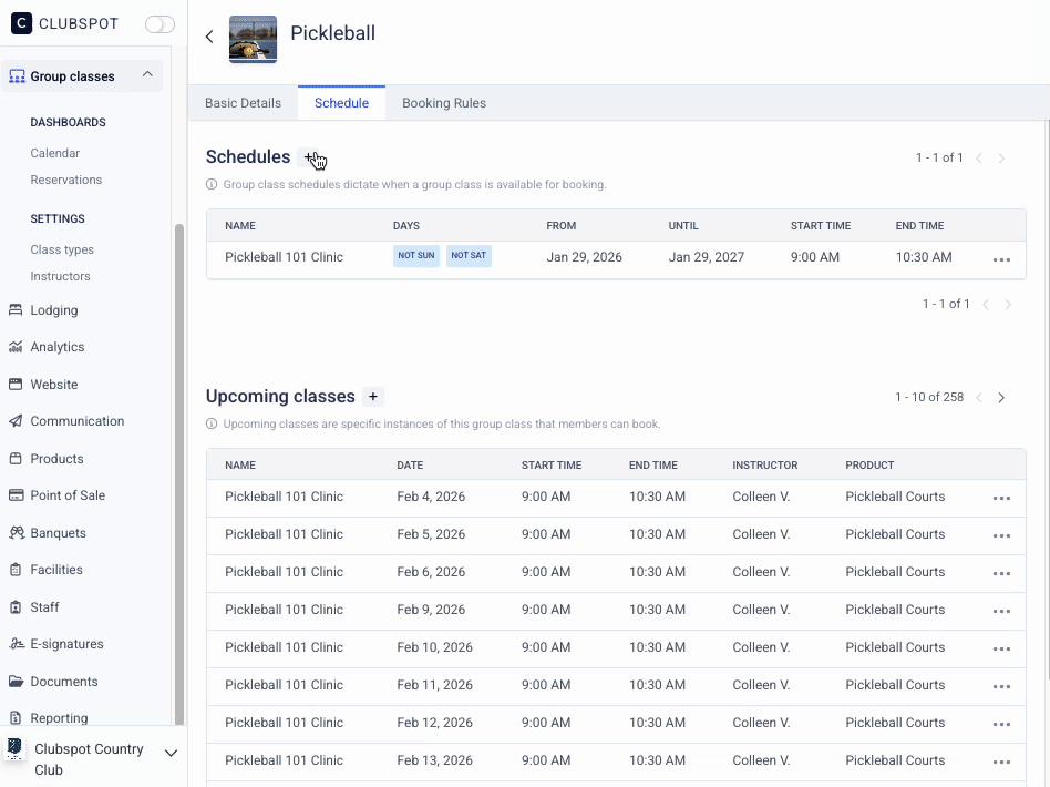 Once all three elements are set up, you can put them together in a class schedule. Here you'll be setting up the parameters for when the class is offered. It's possible to have more than one schedule for each class type, which allows for flexibility on different times of day or days of the week.