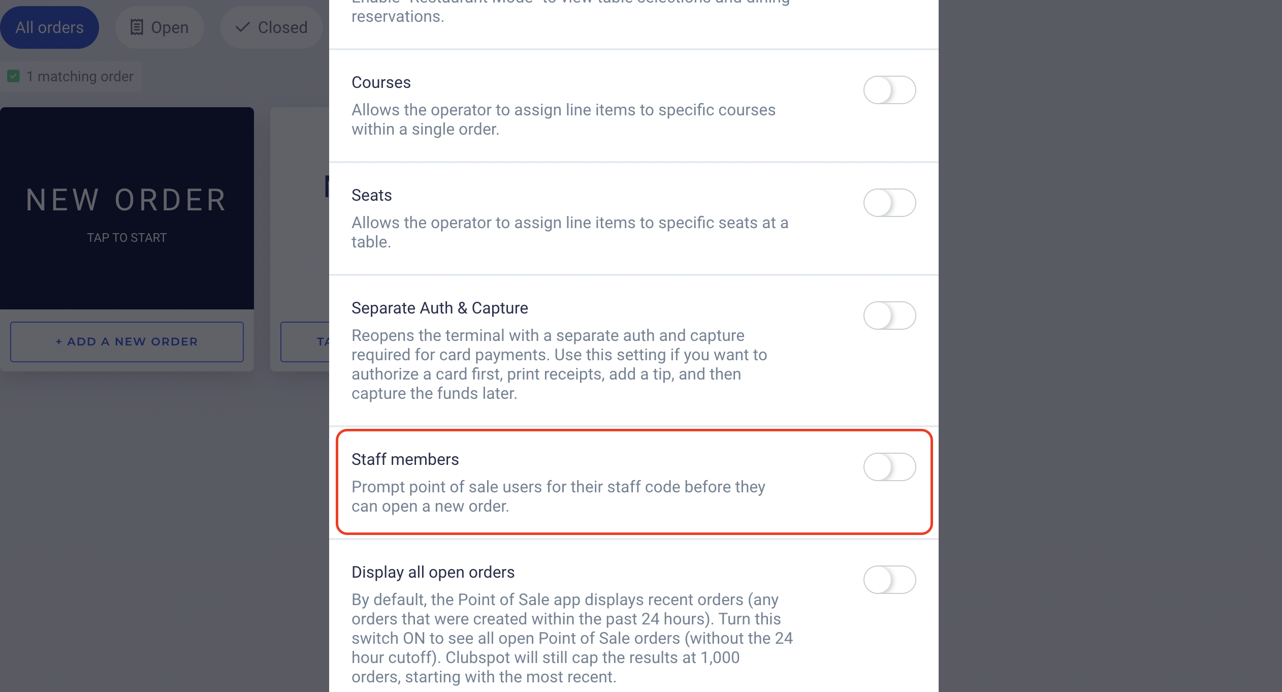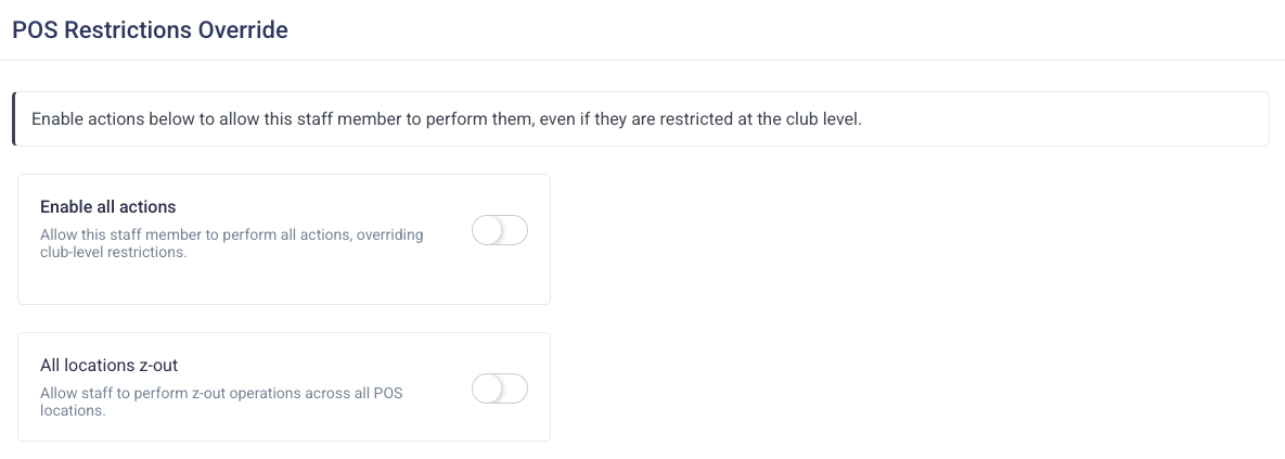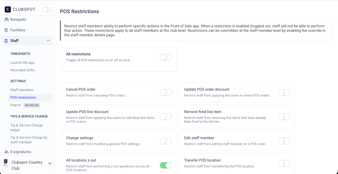 To edit staff restrictions, head to staff > Settings > POS restrictions. Toggling these actions on ensures that staff will not be able to perform that action. These restrictions apply to all staff members at the club level.