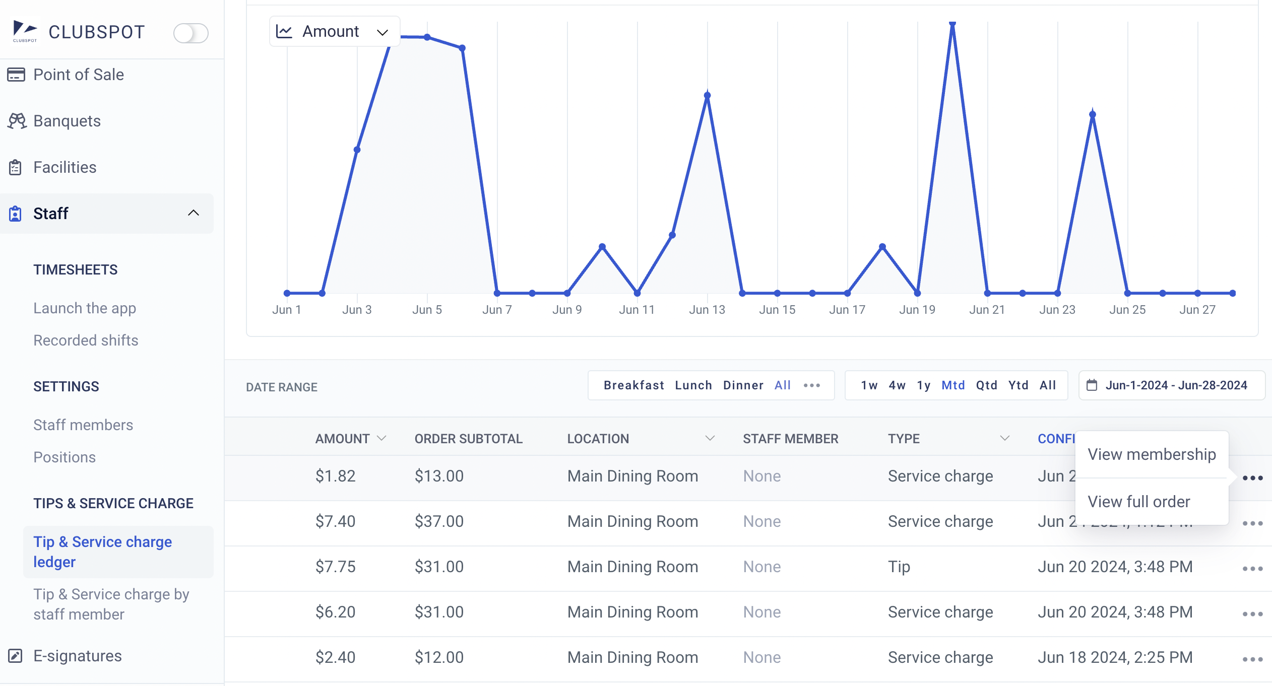 From Tip & Service charge ledger, by clicking on the three dots on the right side of each line item, you have the option to view the full order, view the membership of the customer, or preview an invoice. You can also click on export in the top right corner to export this data.