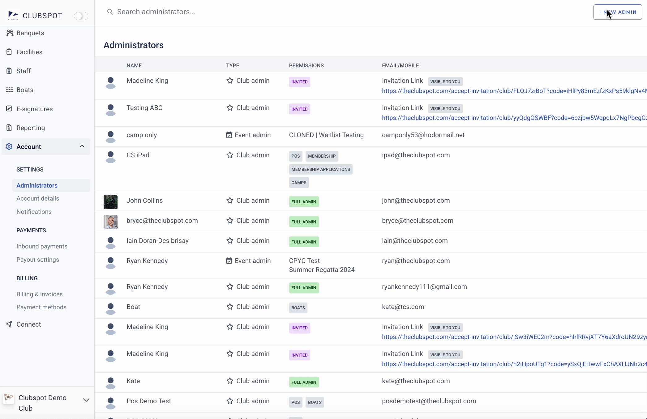 Clubspot provides fine-tuned controls to grant access to specific areas or functions within the dashboard.
