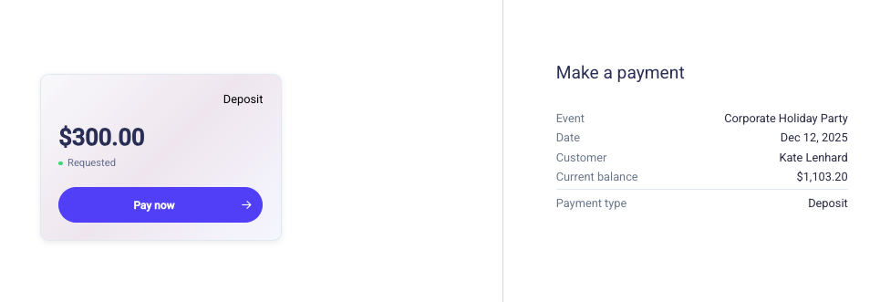 In V2, deposit requests are initiated by clicking the Request payment tile from the Billing page. Populate the value and the due date of the deposit request to attach it to this BEO.