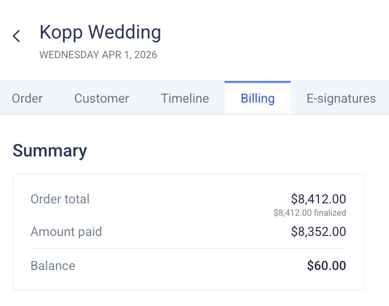 Simply, the balance reflects what is still owed on the event after accounting for all charges and all money received. This balance is displayed on the event table, the bottom of the event order, and the top of the event billing page: