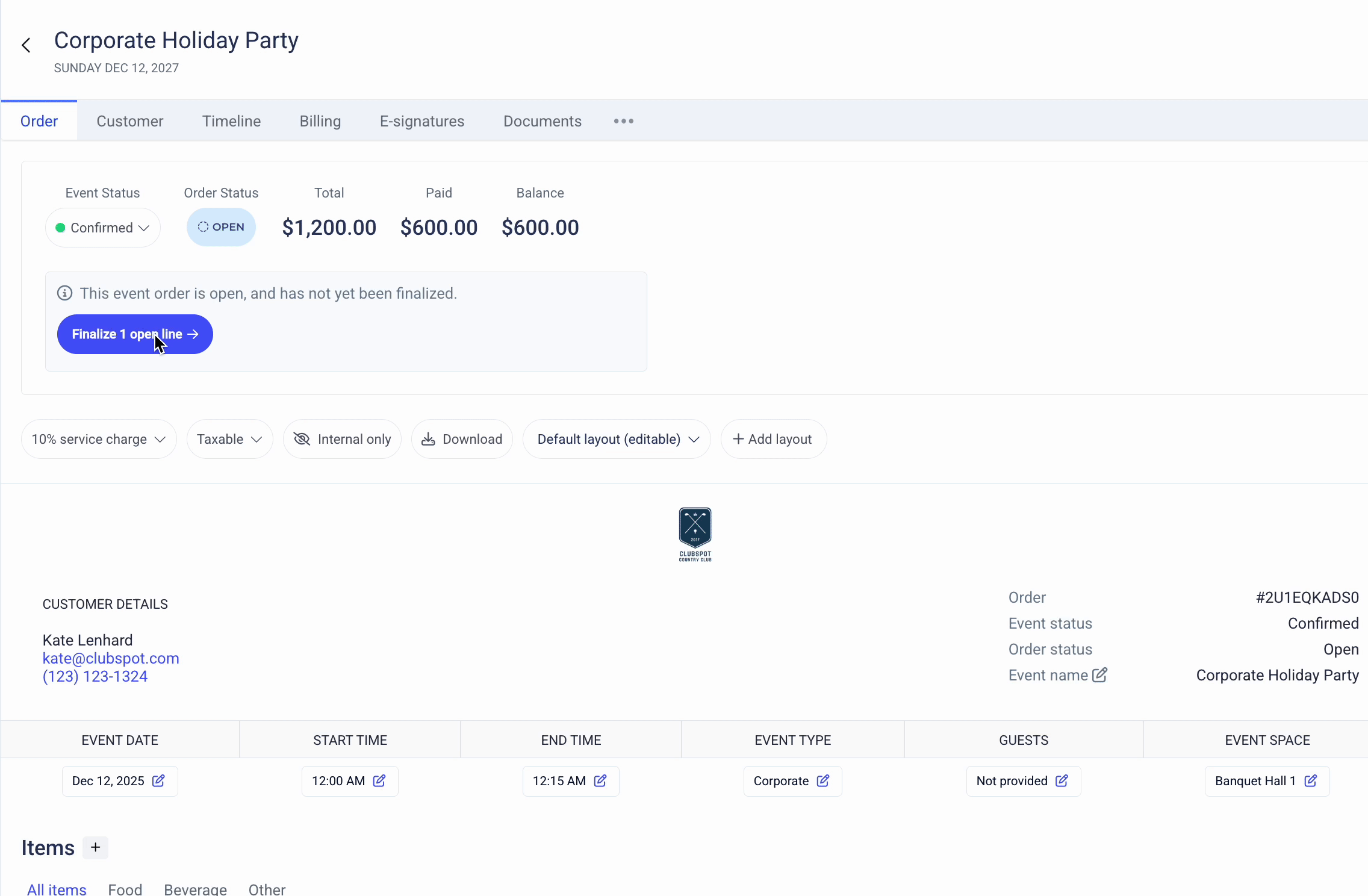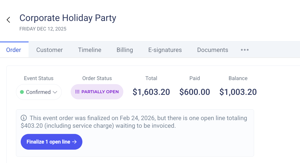 While you cannot edit a line item that has already been finalized, it is now possible to add more line items to events that have already been finalized. This feature can help with last-minute changes and consumption-based charges. If you do add new line items to a previously finalized invoice, its status will become "partially open". To bill for those additional line items, you'll need to finalize them: