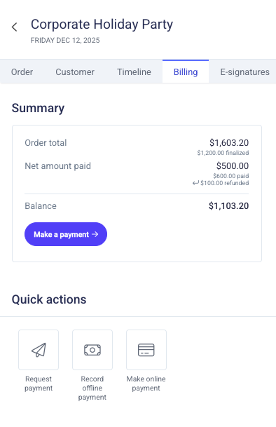V2 banquet events no longer need payments to be tied to a specific invoice. Our new flow allows payments to count towards a general event balance. Admins will recognize the quick action tiles on each event's billing page, as they align closely with the quick actions associated with a membership's biling page: