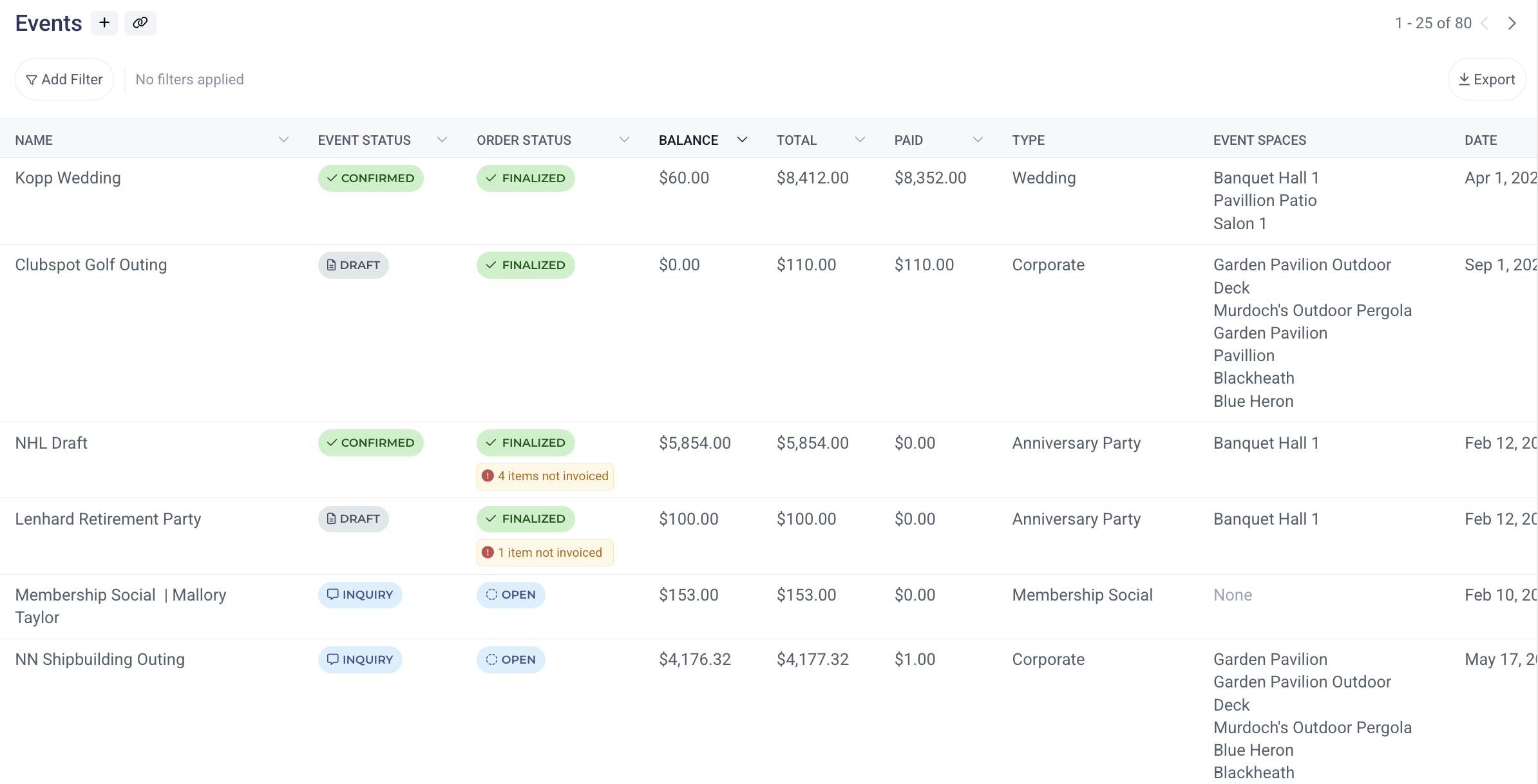 The banquet table includes new financial columns to determine the event balance, total, and amount paid at a glance.